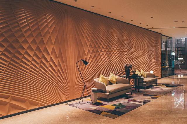 两面巨幅背景墙都是3D打印出木雕般的肌理感。