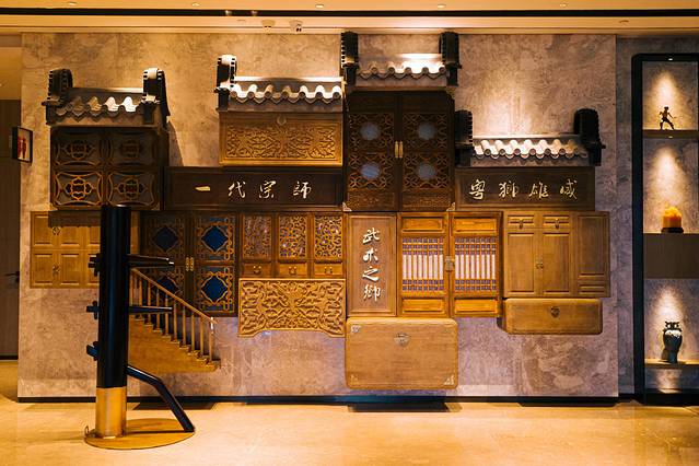 一出电梯口便能看到巨幅艺术装置,青砖镬耳、木雕花藤、满洲窗、乌木桩,仿佛穿越到了黄飞鸿的演武厅。