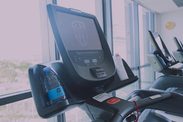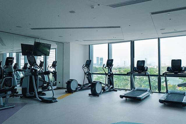 健身房配备的是美国进口必确品牌健身设施,动感单车、跑步机、椭圆机、划船机、器械很充足。