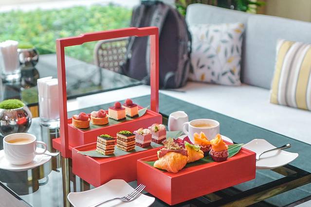 除了比较西式的下午茶,这里还有复古的食盒下午茶。朱红的配色,显得食物更加诱人可口。