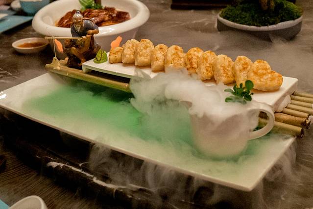 这道意境菜宛如一幅写意画,把临江垂钓搬到了餐桌上。鲮鱼藕饼清甜爽口,能吃出食物的自然之味。