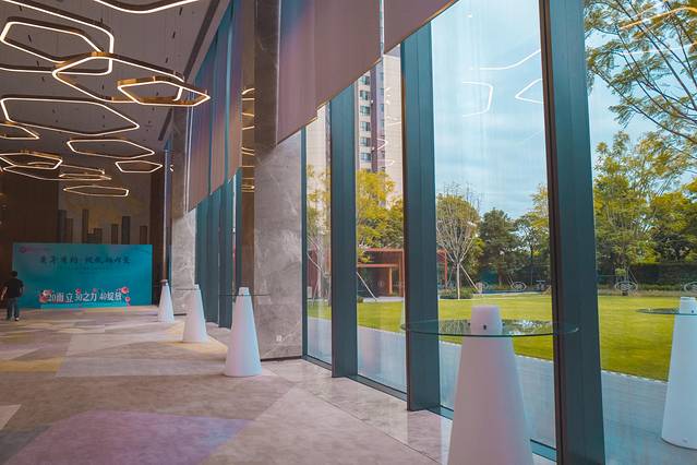 大堂两侧的屏幕是采用创新LED技术的冰屏,我站在一侧观看的时候,画面就像悬浮于玻璃之上,但是又不影响玻璃的采光功能。显得整个空间十分通透明亮。