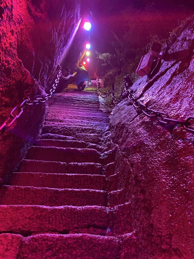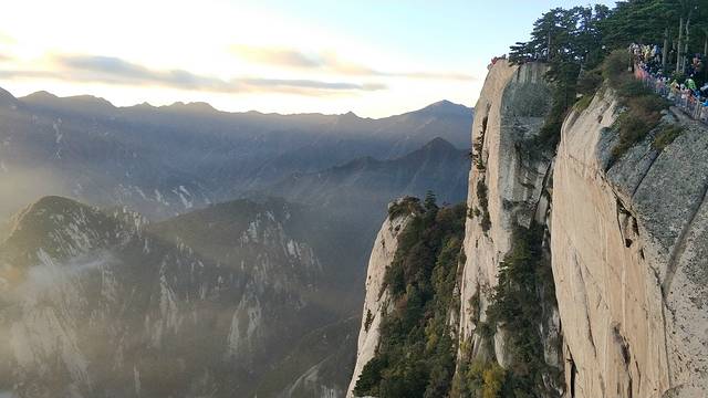 北峰:四面悬绝,上冠景云,有险绝的苍龙岭。我们其实是夜爬的北峰,黑麻麻的,但也能感受到两边的绝壁,十分震撼····从群里找了张别人分享的给大家看看~~