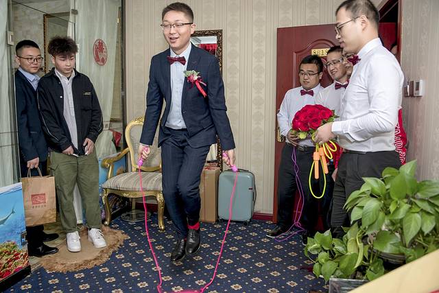 第一关:跳绳,每人9下,意为“长长久久”丫偷笑 本来还打算让他们在挤压板上跳的,结果找了一下午也没找到糗大了
