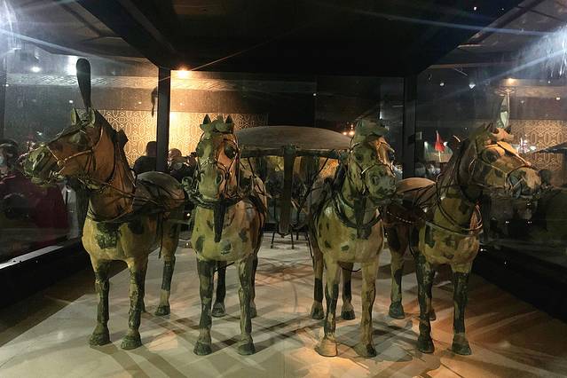 接着是铜车马展厅,国宝级文物。秦陵铜车马一组两乘,出土时碎成3000多片,经过8年的精心修复才得以展出。两乘铜车马一为“立车”,一为“安车”,均为古代单辕双轮车,按秦代真人车马1/2比例制作的。