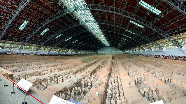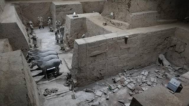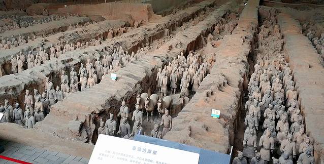 兵马俑即制成兵马,战车、战马、士兵等,共有一号、二号、三号坑,刚出土的时候都是彩色的,但很快就被氧化剥落了,科学家们也在努力找着可以保护他的办法,正因如此,我们看到的只是很小很小的一部分。
