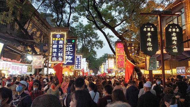 回民街在一千多年前的汉朝就是丝绸之路的起点呀,一些古阿拉伯、波斯等地的商人、使节、学生来到繁华热闹的长安城后,就在这里经商、留学和做官,一代代繁衍生息,在回族,男性都带着一顶伊斯兰教的白色小圆帽,女性在结婚后就一直带着头巾,所以,我们在回民街看到的大多数店家小伙都是这样的打扮。
