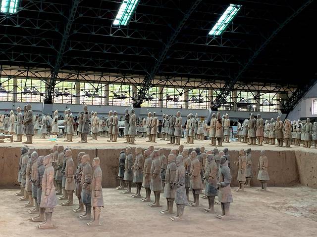 最有看头的就是一号坑了,以战车和步兵相间的主力军队为主,总面积14260平方米,约有8000个真人大小陶勇,千人千面兵马俑整齐划一的列队在一起,每个俑手里都握有兵器,被收到别的展厅了。