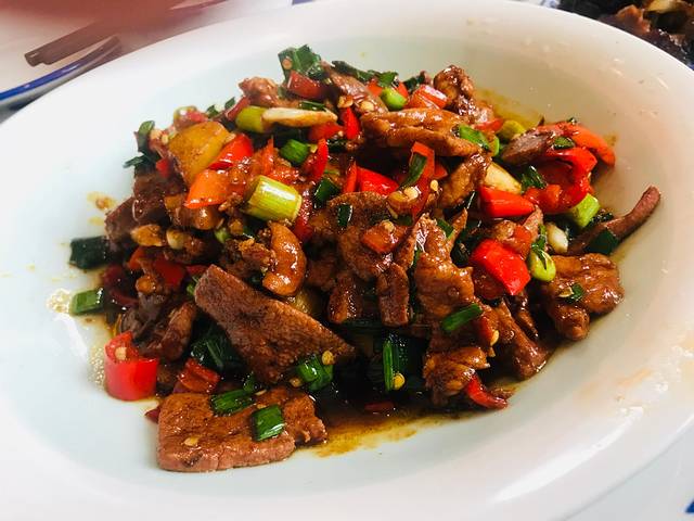 一锅乱炒,里面有猪肝、里脊肉、辣椒,点菜的时候小哥哥说这个菜特别辣,其实还好,对于北方人来讲也就是微辣的级别,哈哈。猪肝和里脊肉都很嫩,这个拌米饭也是超级香的。