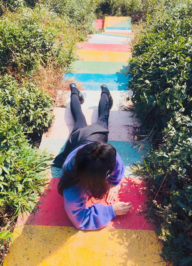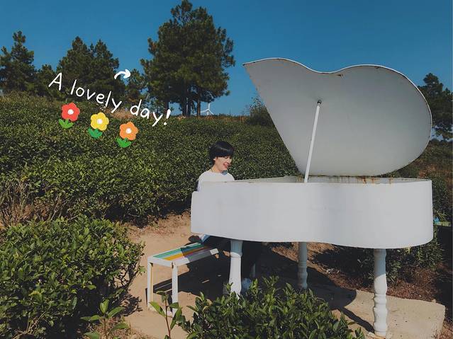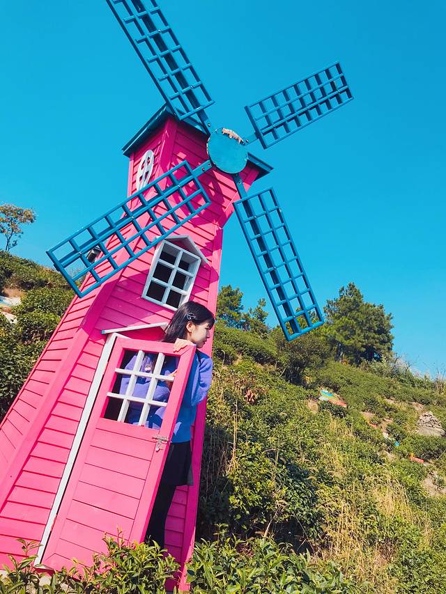 另外一段步道就是要沿着山坡往上走了,两边是茶园,中间的石头小路被涂成了五彩斑斓的颜色,能拍照的地方就只有一个风车、一架钢琴和一个玻璃的台子。