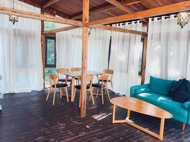 这个是我们房间的小客厅,整体是用木头搭起来的,四面都是大大的落地窗,外面还有一个小阳台,超级喜欢这个房间。晚上我们就坐在这里打麻将喝酒,特别舒服。