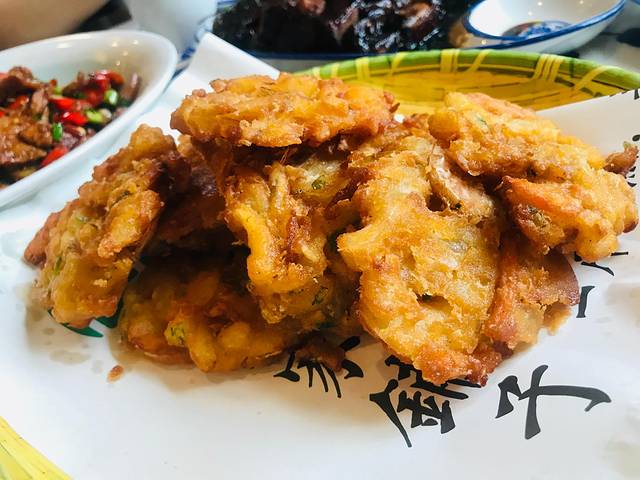 虾饼里面有小河虾、洋葱、胡萝卜,好像还有土豆,口感比较软糯,但是稍微有一点油。