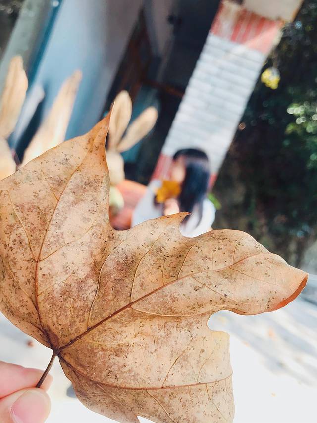 这个季节,满地都是刚刚飘下来的梧桐叶,随便拿起来一片,就是绝佳的拍照小道具,这个叶子拿了一路都没舍得扔掉。