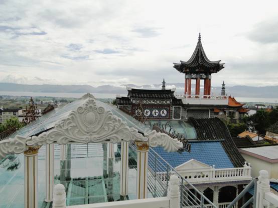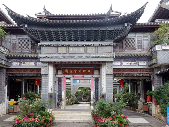就在收拾行囊时,佳佳突然哎呀叫出声来。原来,她的舅妈推荐她再去一个叫做大理张家花园的景点看看,说不去会是个遗憾。我们看了一下路程,就在观音塘北麓,离我们住的酒店只有两站路,于是说走就走,坐4路公交车观音塘站下,一处气势非凡的仿古建筑群就展现在眼前了。