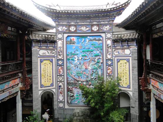 这里的房屋雕梁画栋装饰精美,难得的是格局也很讲究,很有点老北京四合院的感觉。但通过导游姐姐介绍才明白这里虽然也有照壁天井之类,终究还是和汉族的四合院有差别的。导游姐姐说的太专业,我也没怎么听懂,反正就是白族的建筑很有特色,风格上汲取了北京四合院的特长,又结合了自己的民族文化之类吧。