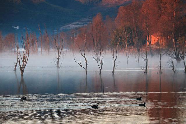 水中嬉戏的黑颈鹤让原本寂静的水面增添几分趣味,波光粼粼的水面折射出来的光线成为了摄像师们最为喜爱的时刻,不同角度的照片会有不同的感觉,每一次都是光影最好的结合。一群群结伴在湖边觅食、嬉戏,好像它们才是这片土地的主人。而在那白花、绿植、黄叶与红土相间的五彩斑斓的田间,偶尔还会有一只白鹭跟在农夫身后,没有丝毫的畏惧,体现出了人与自然之间的和谐,也可能是千百年来的和谐共处的结果吧。