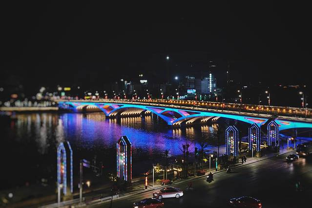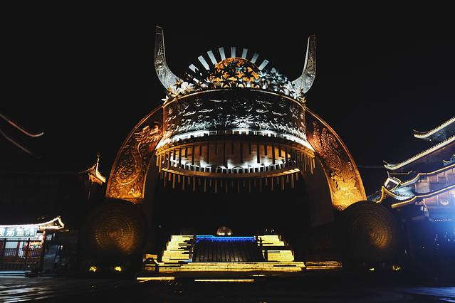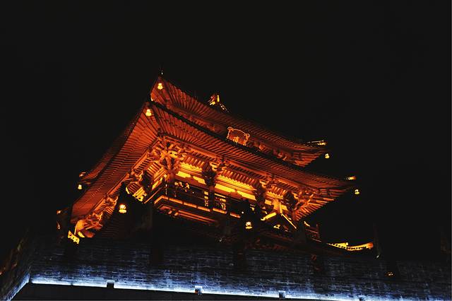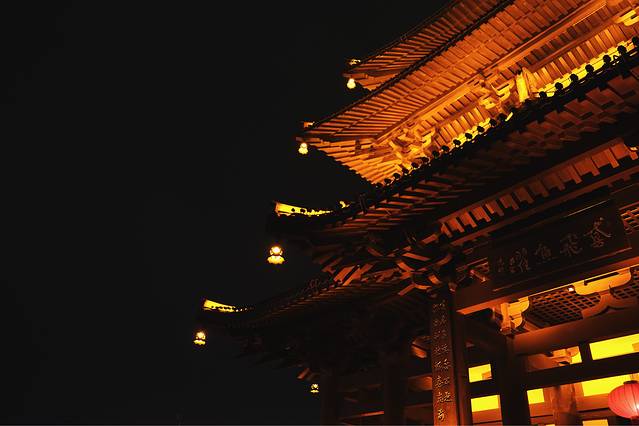 正骑着车,左手边看到一座桥,停下来拍了拍照。往右手边一看,咦,一个亮灯的古建筑,上面竟然还有人,那一定要去看看了。