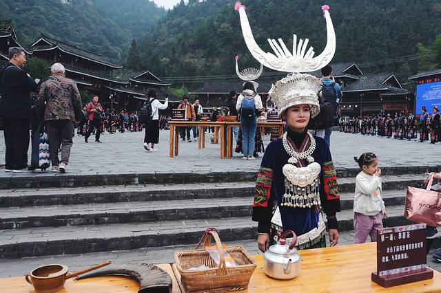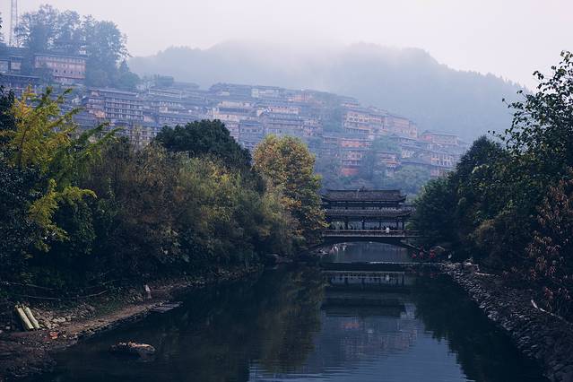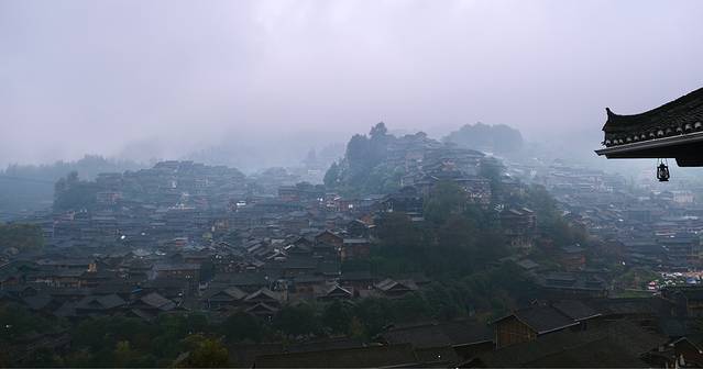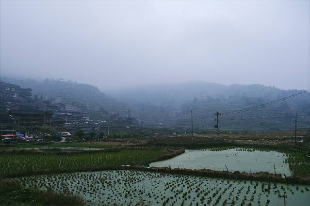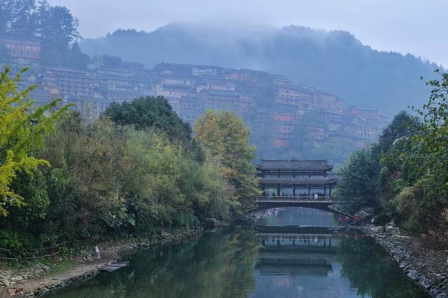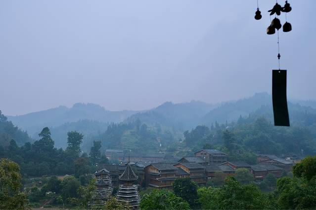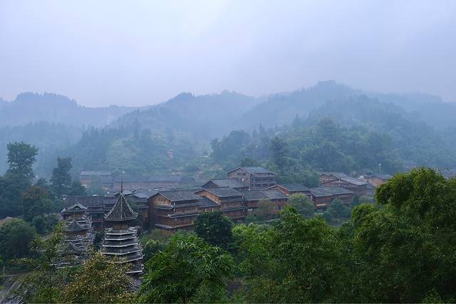 早上九点,雾气蒙蒙的苗寨依旧宁静。