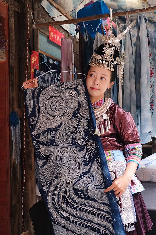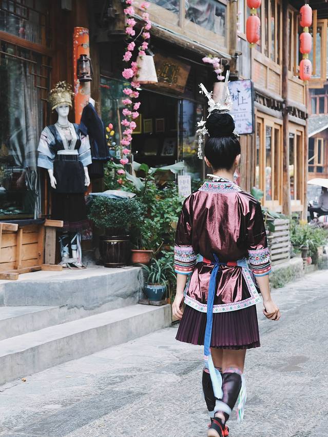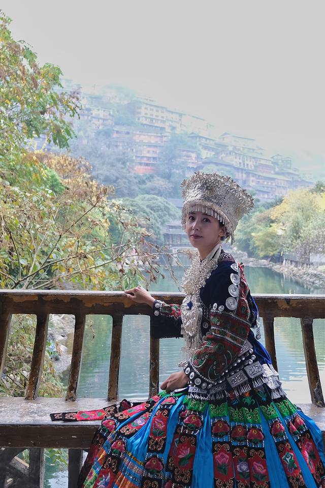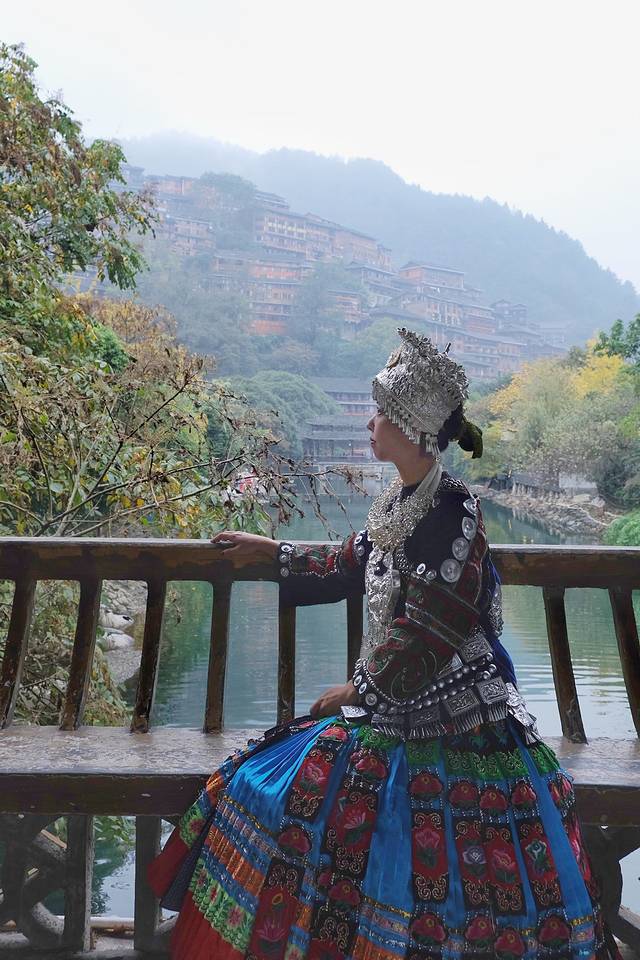 我选的这套是比较传统的款式。老板说这边的苗服原本就是只有蓝色,其他的颜色款式都是根据游客的需要做出来的。价格30-80元/小时不等,我这套讲了价是50块钱两小时。穿的时候一定要跟对方说头别箍的那么紧,我拍了一会儿感觉脑袋都要裂开了。