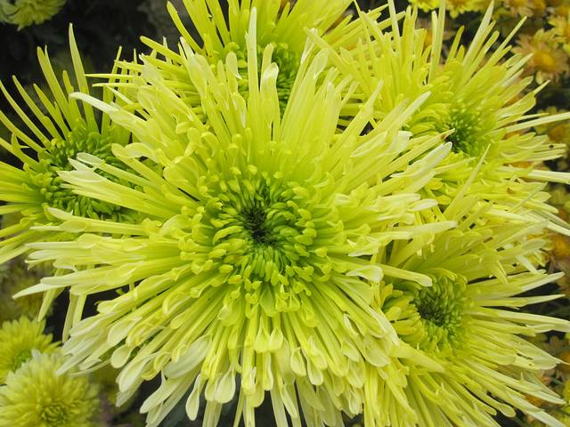 最爱的是一种绿色的菊花。绿菊品种众多,但最喜是绿芒。花朵不管不顾地盛放,细细地绿色花叶真像芒刺一样,又像满身刺的小刺猬,成为娇娇的花儿最美的武器。绿色清新纯净,压下绿芒张扬的盛气,成群结队的花,更如画怡人了。