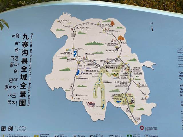 这是全县景点,九寨沟风景区是一个倒Y型。一进景区就有摆渡车,跟着摆渡车的路线走就行,我们时先去了长海-五彩池一线,差不多完了6个小时,后面的一些景点就没再下车,感觉都有点差不多了,就去了一些著名的。