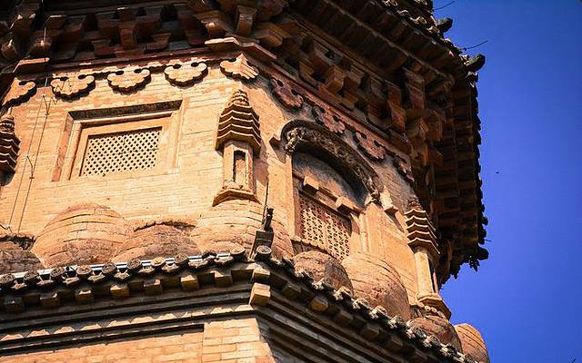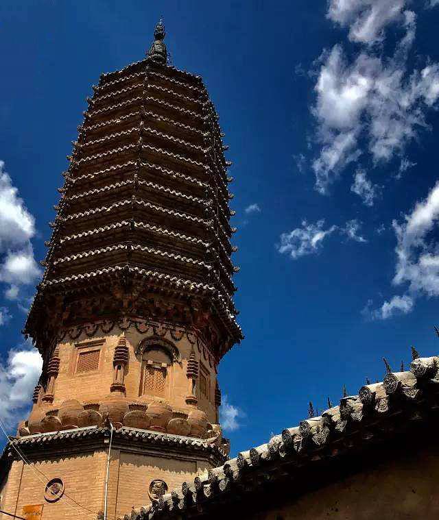 蔚州自古有“先有南安寺,后有蔚州城”的说法。南安寺塔始建于北魏年间,是一座八角十三层的实心密檐砖塔,塔高32.1米。砖塔造型十分优美,塔座精雕细刻,雕有兽头或福、禄篆字,上边砌有仿木砖檐,檐上围砌有密而匀的仰莲瓣三周,使塔身置于莲花座中宛如一朵莲花将塔身托起。