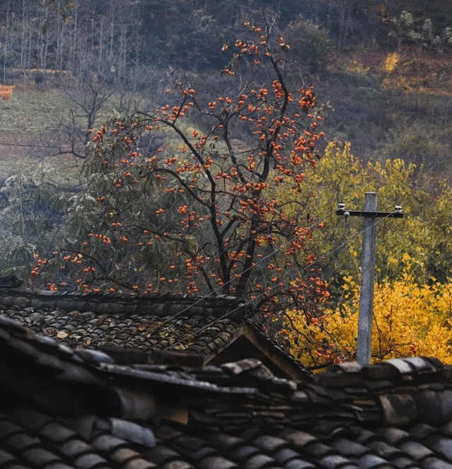 除了气势磅礴的秋色,这里还有着温柔的小景,房前屋后、公路旁、小道边,偶遇的一颗柿子树,正满是金黄,挂着丰硕的果实。