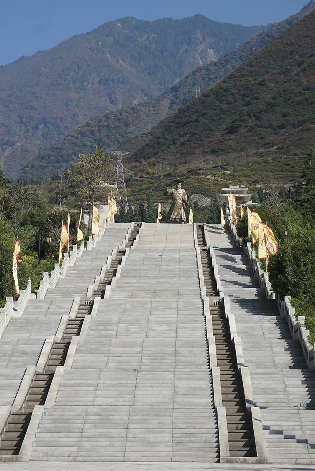 都汶高速快到绵虒服务区时,右边看到一巨大塑像耸立在远处石阶上去的山上,这就是大禹祭坛了,这里也是大禹文化旅游区,离成都109公里。