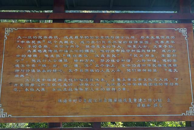 从祭坛介绍的文字可知,大禹不仅是治水兴农的先师,更是中华国家文明诞生的初祖。大禹出生在汶山郡广柔县石纽乡,就是今天的绵虒镇。汶山即岷山,所以这里是以大禹为酋长的夏后氏部族早期发祥地。