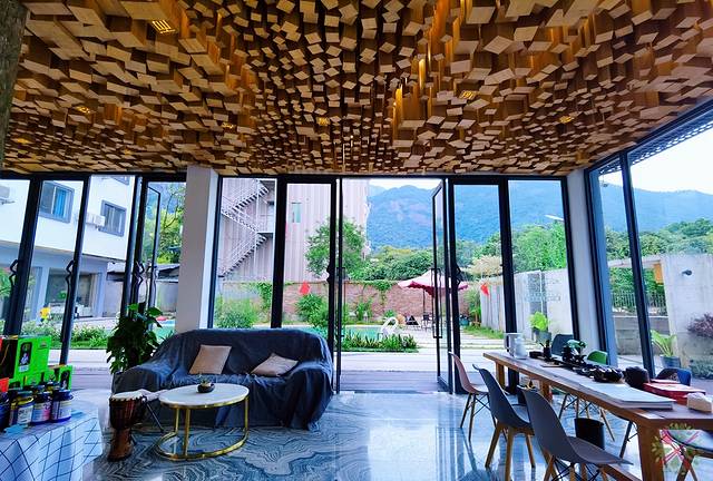 走进民宿大堂,天花板上的木方通引入眼帘,设计师想表达三千大千世界,寓意人们心中向往的蓬莱仙境。