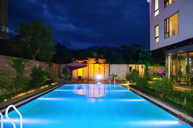 从心隐艺术设计民宿由新加坡英国皇家建筑师设计,走进民宿门口就是泳池,用的是白水寨天然山泉水,白天看似平淡无奇,夜晚下的泳池灯光变换,显得格外迷人。