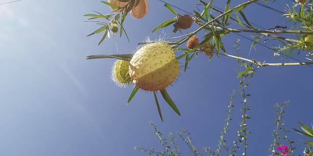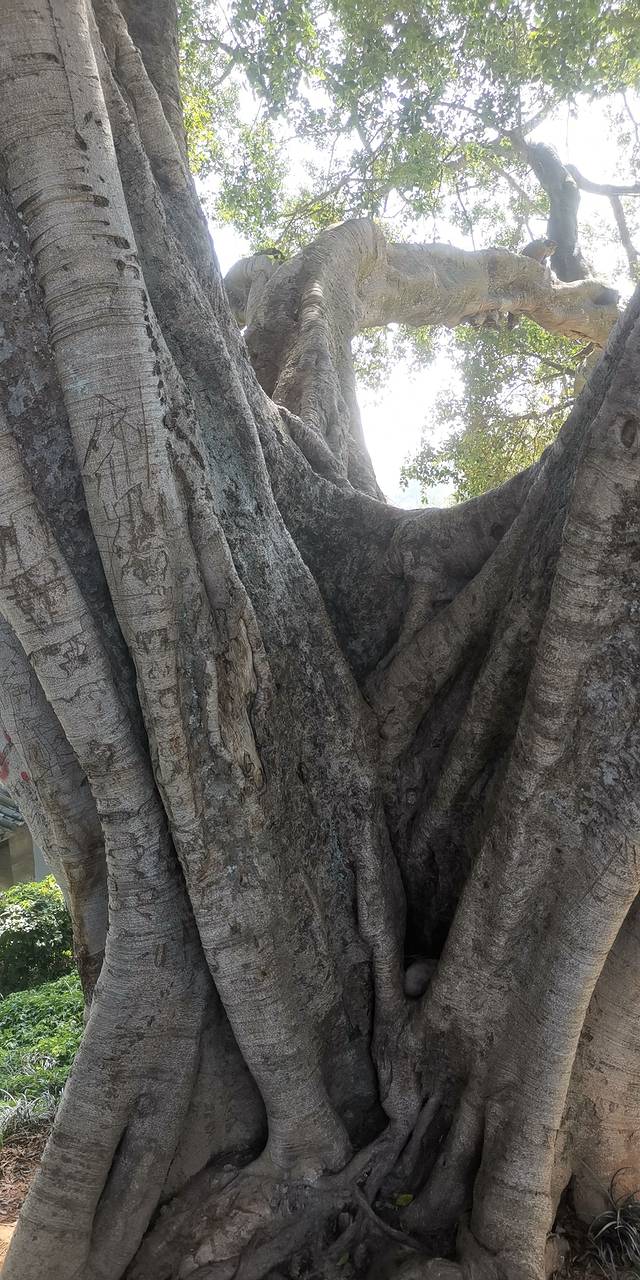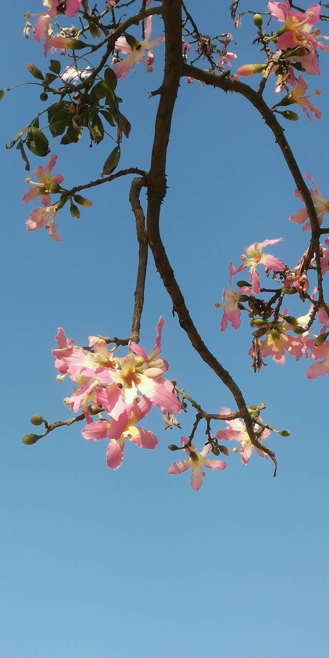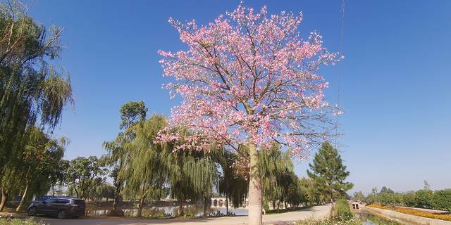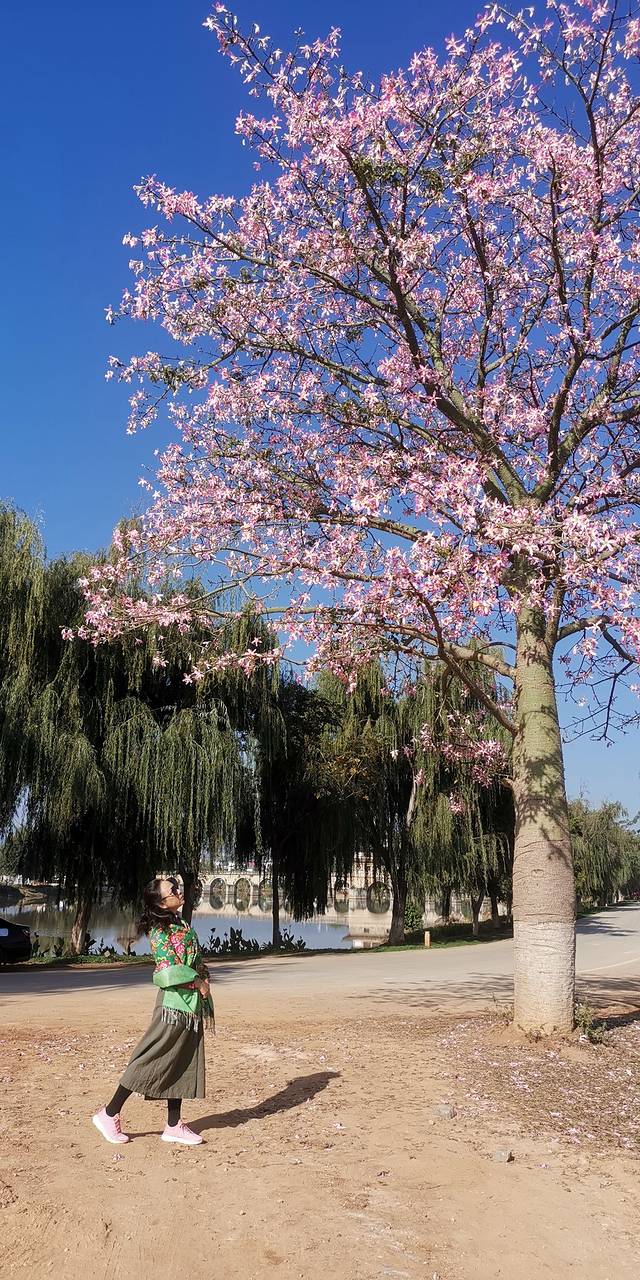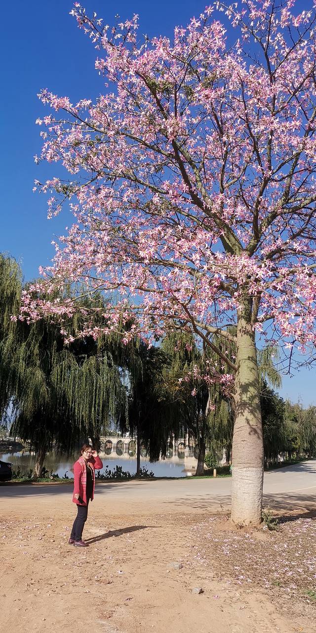 古桥旁一颗仙仙的,粉登登的美丽异木棉树(也称之为美人树、丝木棉)