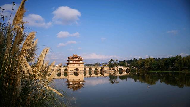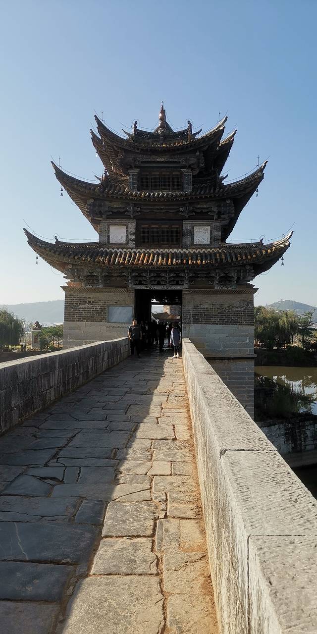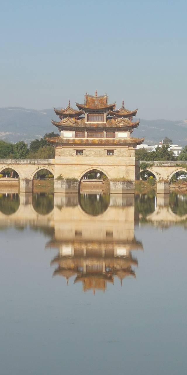 11月11日上午来到建水最著名的古景之一-----双龙十七孔桥。桥中建有三层楼阁,两端各有亭阁一座。桥身用巨石砌成,全长148.26米,宽3米,远看犹如一艘楼船,近观似长虹卧波。它造型奇巧,是我国现存的优秀古桥之一。