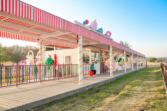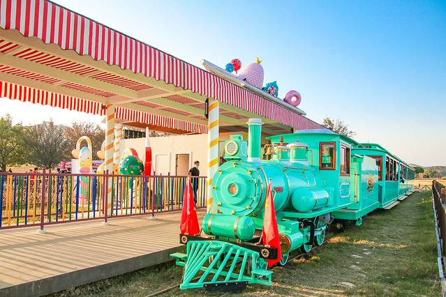 呜……呜……呜……伴着几声悠远的鸣笛声,小火车开动了。时而穿过糖果峡谷,时而穿越格桑花海,时而路过种满玉米的农田,时而又在紫藤花廊中穿梭……上一秒还是辽阔的草原风光,下一秒就到了充满童趣的巧克力山,那种感觉简直比爱丽丝梦游仙境还要奇妙。