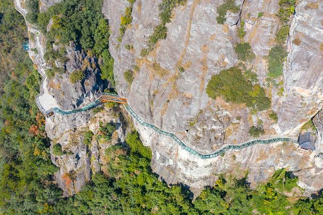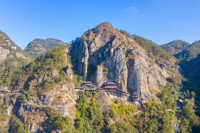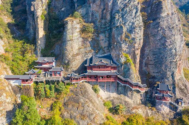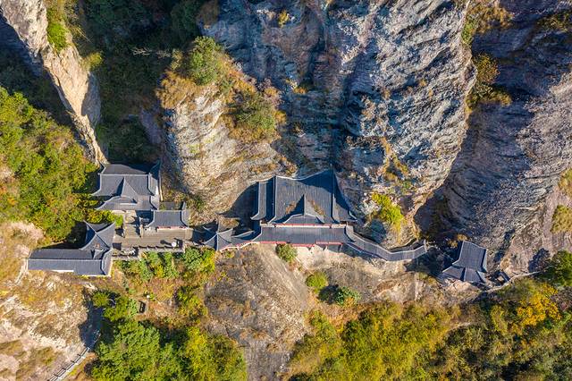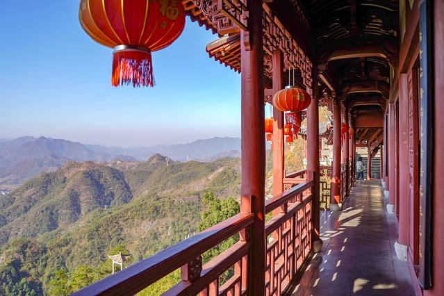 此处的悬空寺与山西恒山悬空寺有异曲同工之妙,主殿为地藏王大殿,依山而建高3米,长60米,它一半嵌入岩腹,一半悬于半空,十分壮观,立在主殿驻目望去,远处的山峦河川尽收眼底,飘飘然竟有种俯瞰天下的感觉。
