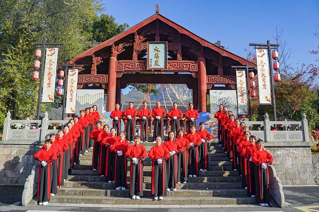 这日天朗气清,惠风和畅,下了高铁打车40分钟便到达大慈岩景区的正门,笔挺古朴的牌坊没有过分的去雕龙刻凤,胭脂色的牌身也与身后小景的蓝调前后映衬,显得格外亮眼。