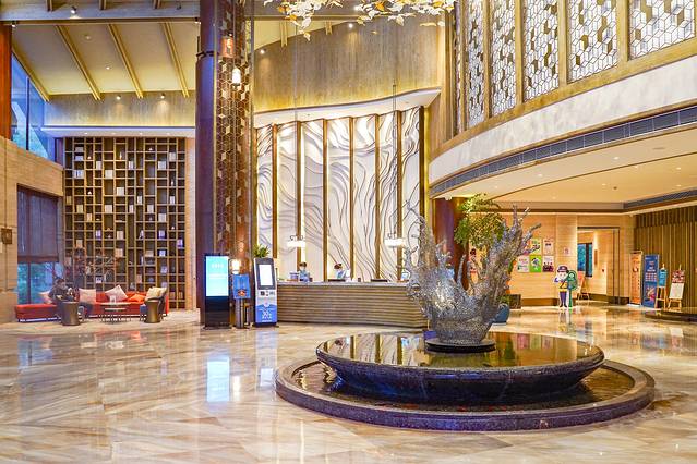 进得大厅,高悬在大堂上空的白色水晶叶片,如浩瀚中的星数,暖黄的灯光把周围照得金碧辉煌,行云般的地砖通铺地面延向远处,与近处的接待台、装饰书架衬托着空间无限大气。