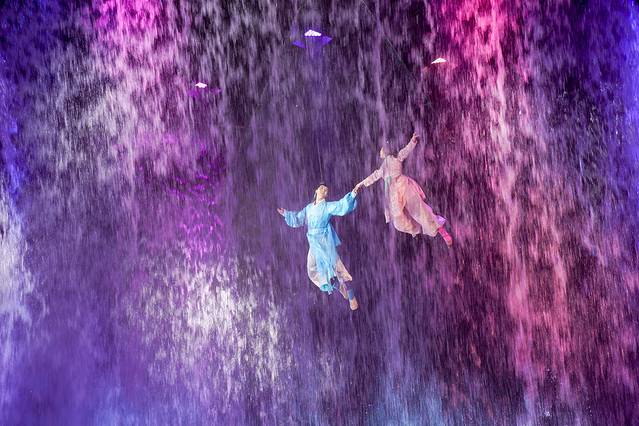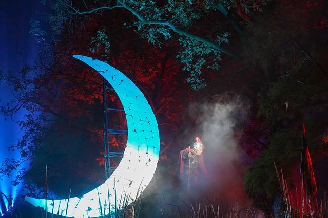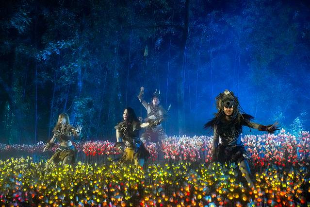 伴随着音乐响起,黑漆漆的台上亮起霓虹色的灯光,近处的草木皆被镀上一层颜色,五光十色霎时好看,正沉迷这宏大场景时,不知哪飘来一团白雾,把近处的一切吞了进去。