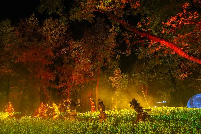 接着便响起一阵春雷轰轰响起,草木开始生长起来,随风摇曳,这时不知从哪跑来几只麋鹿,左顾右盼,轻盈地在草木中奔跑,直至消失在远处深邃幽暗中,这时周围的声音戛然而止,只听得几声鸟叫,花儿流水般次第开放,渐渐映入眼前的是一片美到极致的五彩花海,紧接着便是喃喃的几句人语,一群建德人手持短棍和长刺游弋花海,一堆篝火慢慢点亮,映亮火旁一男一女,首领装束的男人搂着自己处于孕期的女人呢呢喃喃,人们渐渐将他们环在中间,舞之蹈之。聚光中,几头野鹿再次跑过,被围在中间的首领一声呼啸,便领着族人去追逐哪隐入草木的野鹿。这段建德人的起源,随着追逐野鹿渐渐隐去。