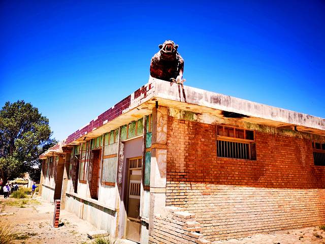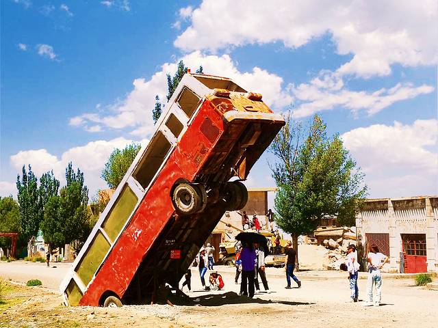 亲眼目睹和看照片是两种感觉,它特别生动地展现了初中地理书上有关城市形成的内容。小镇破旧不堪,尽管被《九层妖塔》带成了网红,引来了各地如织的游客在大头朝下、斜插入地面的公交车前拍照留念,颇有些变废为宝的睿智和高明,但是这些都无法遮掩那种洋溢在外的破旧,以及那种被遗弃的感觉。