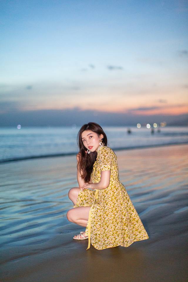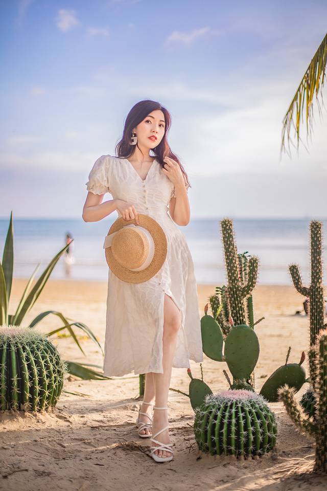 一个拍摄小提示:因为海滩是朝西的,如果想要把海放进画面之中,总避免不了人物是逆光的这个问题,直接拍摄的话人会黑黑的。这个时候可以提高一下相机的曝光补偿,把画面调亮一些,后期再单独调整下人物的光线就ok了。