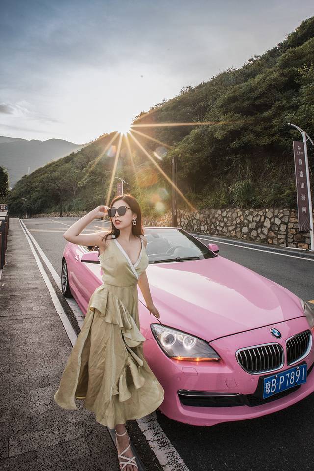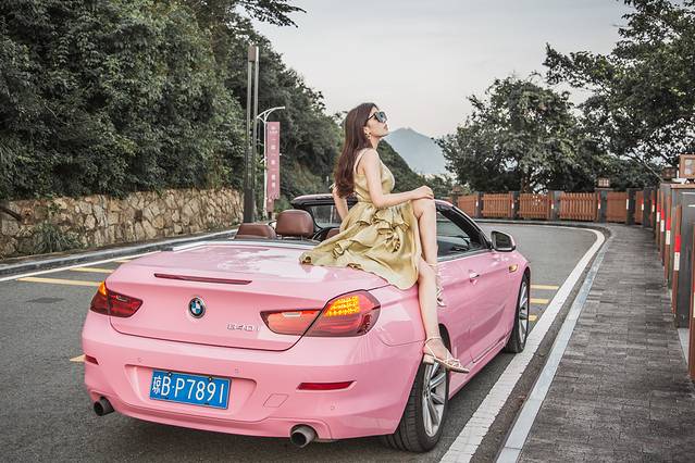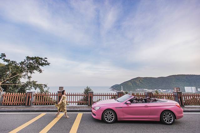 和闺蜜一拍即合,在亚龙湾就有一个豪车租车行,我们租了一辆骚气的粉红色宝马跑车。