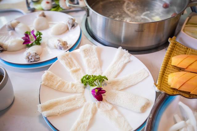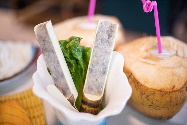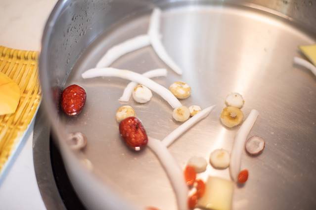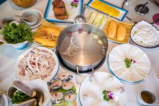 上椰子啦!首先是三个椰子的椰子水倒入锅中作为锅底,服务员会根据我们的口味添加一些矿泉水。先下的自然是鸡肉,每桌都会有一个小小的计时器,下鸡肉后3分钟就可以吃了,这个是鸡肉最鲜嫩的时候,伴着微甜的椰子水,真的特别好吃。