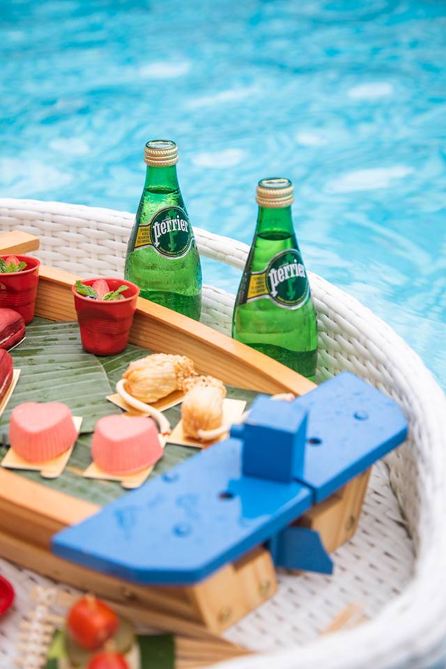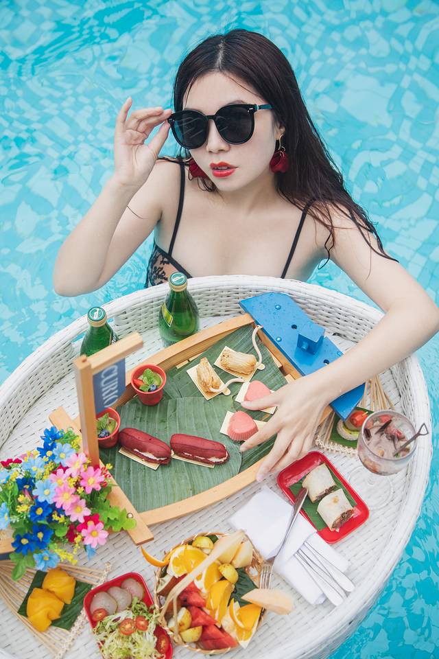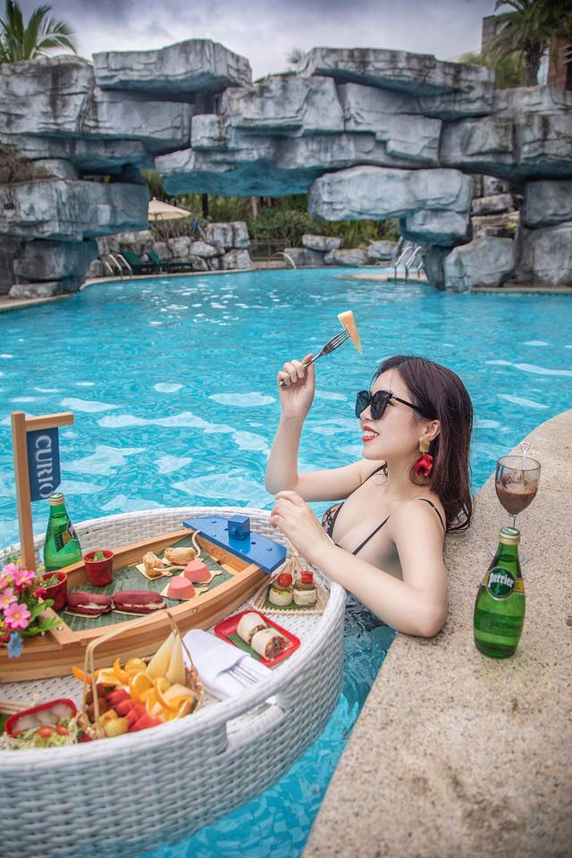 我们还预定了一个漂浮下午茶来配合拍大片。其实下午茶本来可以直接在房间门口的泳池拍的,但是我们不!我们非要把下午茶扛到岩洞泳池去,此处省略一大堆我们和服务员运送下午茶的艰辛,反正最后能拽拽在泳池拍漂浮下午茶就开心!