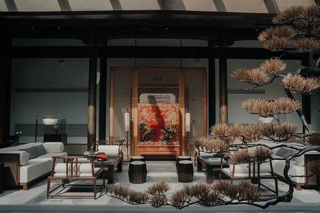 前台正对着的就是大堂吧,浓郁的中式风格,静谧优雅。全木质的家具,透露着中式文化里低调内敛的奢华美。一棵巨大的迎客松将大堂吧分开成两个区域,两个区域从格局和软装摆放都像是粘贴复制的一样,这也是中国美里最讲究的对称美。
