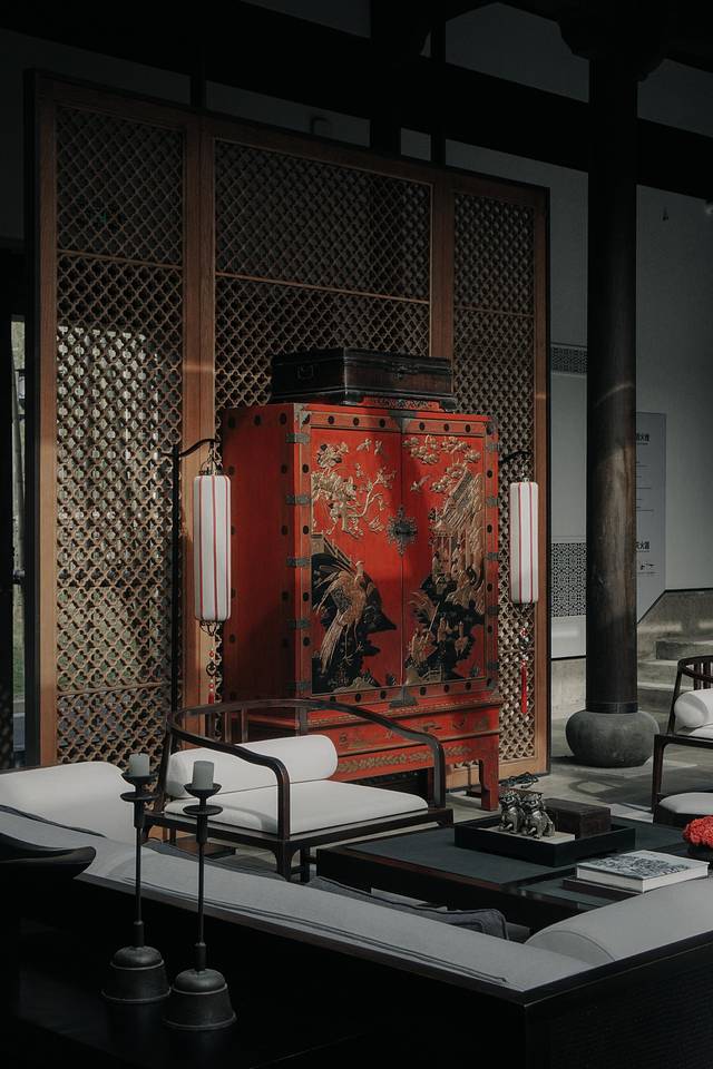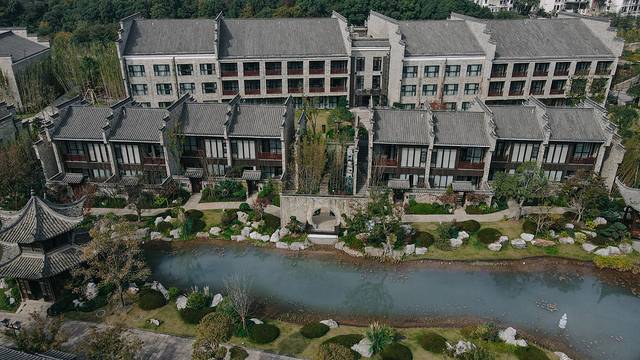悦麓开元观堂酒店最明显的徽派元素就是马头墙,马头墙也是徽派建筑中的重要特色。虽然酒店没有采用徽派的白色基调,但酒店的独栋客房外观顶部都打造成了层层跌落的马头墙造型,徽派配上江南园林,也是很有韵味了。