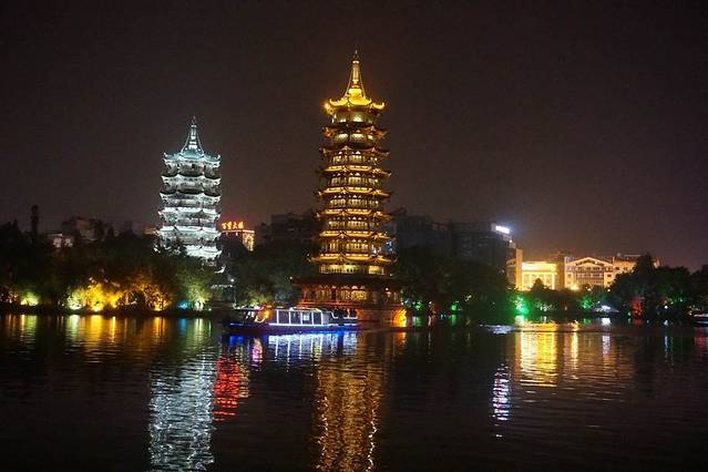 吃过饭之后,我们就去看了桂林夜景。日月双塔真的好好看。但我觉得游船没什么必要。不如在这附近散步看看景色。