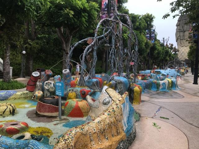 此外这边还有个鱼尾狮公园,因为市区的“鱼尾狮妈妈”我们没时间看,所以这个“鱼尾狮爸爸”,我们还是冒雨来游览了下。总之就是很随意的闲逛,后面有个很漂亮的小花园,都是彩色石头砌成的,有点高迪的感觉。