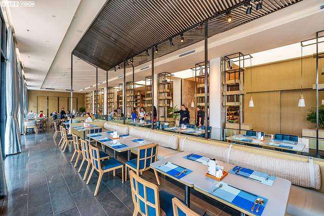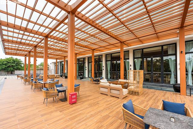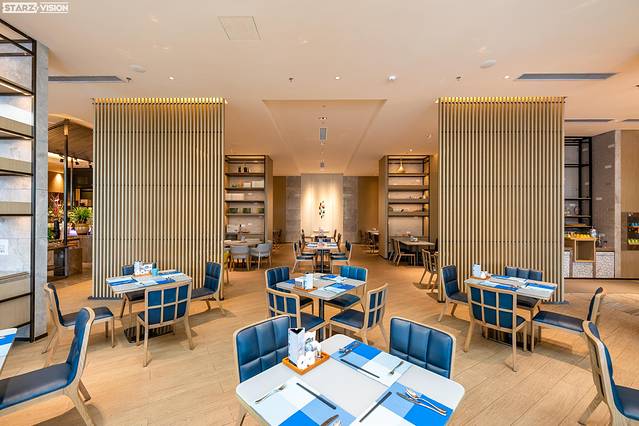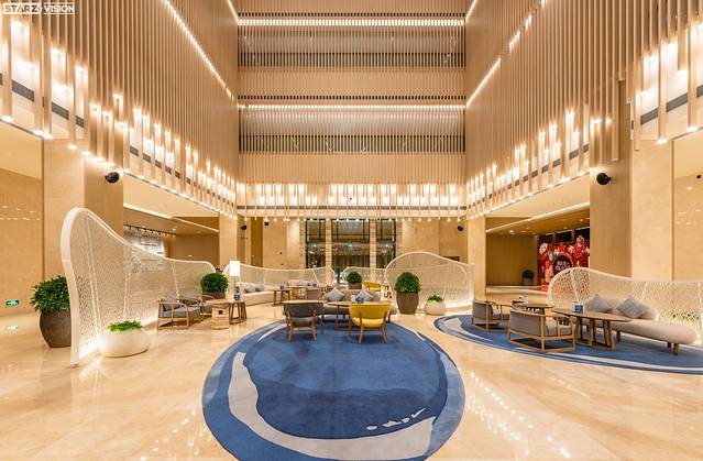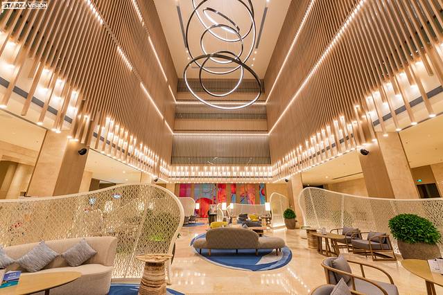 大堂同样运用了现代典雅的设计风格,搭配原木色构件,与天花海波浪形灯饰完美呈现出海洋的气息,并且在大堂吧内采用如“渔网”造型的屏风去点缀,让人仿佛在一艘大帆船内,与海滨度假的理念如出一辙。大堂吧更是一个休闲会客或聚会的场所,提供各式咖啡等饮品,价格实惠,口味也可根据客人需求而更改,是稍作休息的好地方。