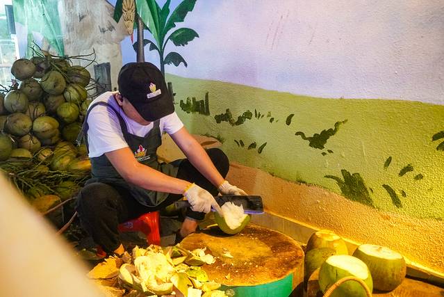 海角院子新开不久,整体环境很清新,里面有几家餐厅,来到海角院子往右边走进去就是小院椰子鸡,一进来就看到有工作人员在砍椰子,院子里随处可见各种树,仿佛走进热带雨林中一般。